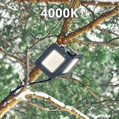Das LED-Flutlicht kommt mit der Farbtemperatur 4000K - Kaltweiß daher. Als Faustregel gilt: Je höher der Kelvinwert, desto natürlicher wirkt das Licht, je geringer desto mehr Rotanteile hat es.