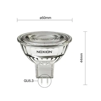 Die Noxion LED-Spot GU5.3 MR16 6.1W 621lm 36D - 827 Extra Warmweiß | Ersatz Für 50W ist eine effiziente GU5.3 LED-Lampe. Das Produkt der Marke Noxion ist der perfekte Ersatz für Ihre konventionelle Halogenlampe mit 50W und einem GU5.3-Sockel, bei dem die beiden Stifte einen Abstand von 5,3 mm zueinander haben. Die Abkürzung MR16 zeigt Ihnen, dass der Reflektor einen Durchmesser von 5 cm hat. Zudem strahlt das Produkt Licht in der Farbtemperatur 2700K - Extra Warmweiß aus und punktet durch eine lange Lebensdauer.