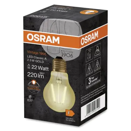 Die Osram Vintage 1906 LED Classic E27 A 2.5W 824 Fadenlampe Gold kann nicht nur durch Ihre lange Lebensdauer von 15.000 Stunden überzeugen, Sie ist zudem so effizient, dass Sie Ihnen im Gegensatz zu herkömmlichen Glühlampen rund 88 % Energiekosten spart. Zudem ist im Preis eine 3 Jahre All-In-Garantie inbegriffen.