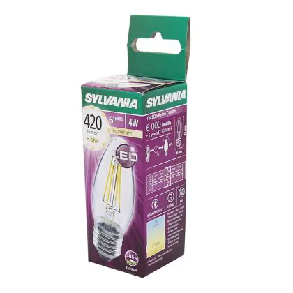 Die Sylvania ToLEDo Retro Candle E27 ist eine moderne LED-Lampe mit Retro-Design. Ihr Verbrauch beläuft sich auf 4 Watt, während sie Ersatz für eine traditionelle Lampe von 40 Watt bietet. Damit sparen Sie ca. 90 % Ihrer sonstigen Energiekosten ein. Die LED besitzt einen E27-Sockel und eine Kerzenform. Sie spendet extra warmweißes Licht mit einer Farbtemperatur von 2.700 Kelvin.